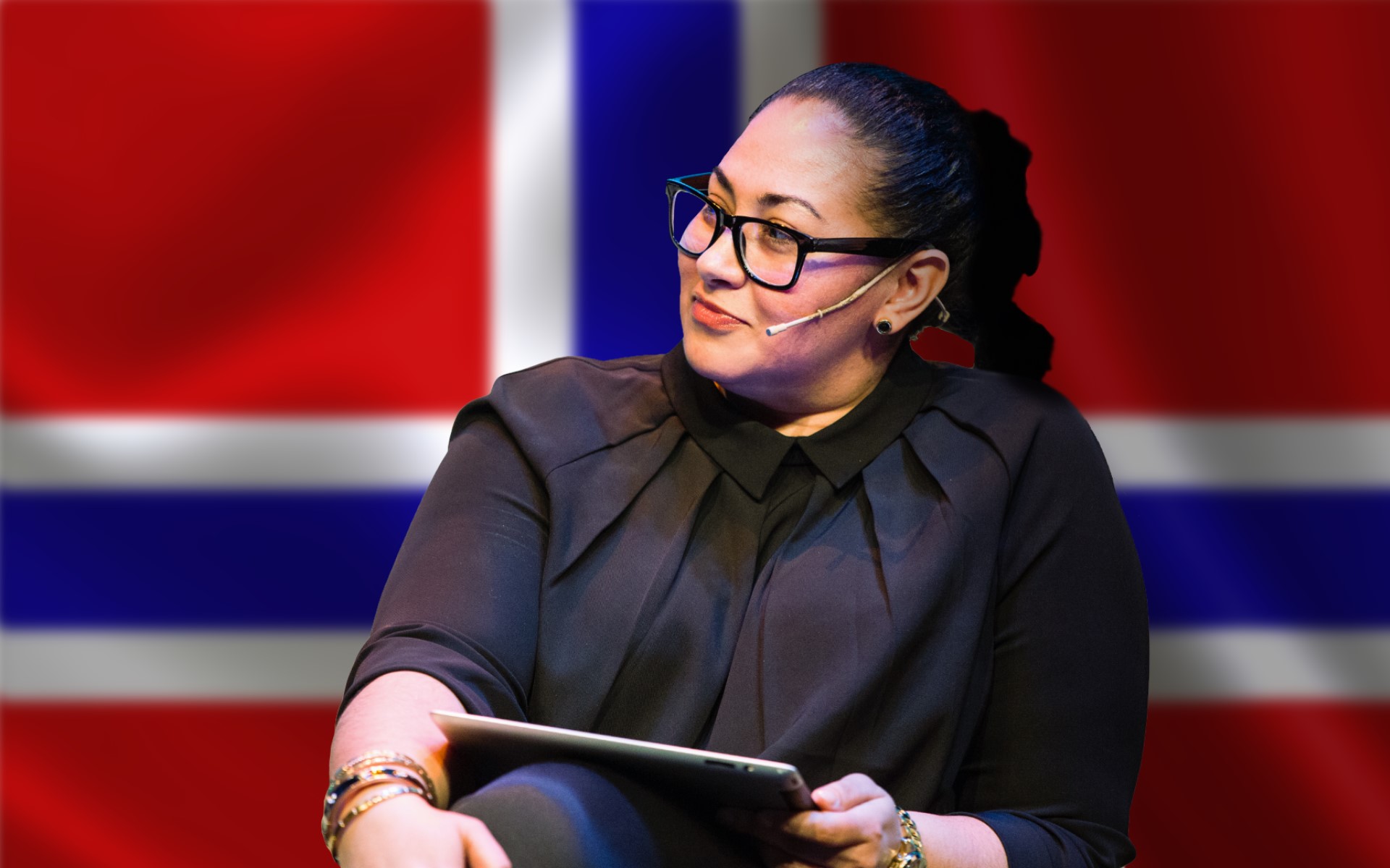 Programleder Sarah Natasha Melbye leder oss i gjennom en sending med musikk, gjester og tradisjonsrike innslag fra Porsgrunns 17. mai feiring.